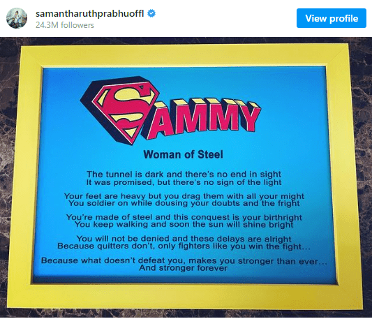 பல கஷ்டங்களை தாண்டி தற்போது தான் மீண்டும் வருகிறேன் என்று சமந்தா ஸ்ட்ராங்கான கூறிய இந்த விசயம் இணையத்தில் பெரியளவில் பேசப்பட்டும் சமந்தா விரைவில் குணமாக வேண்டியும் கருத்துக்களை பகிர்ந்து வருகிறார்கள்.