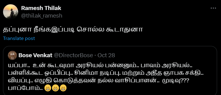 போஸ் வெங்கட் X தளத்தில் பதிவிட்ட ட்விட்டுக்கு பதில் கொடுத்த அவர், தப்புனா நீங்கஇப்படி சொல்ல கூடாதுனா என பதிவிட்டுள்ளார்.