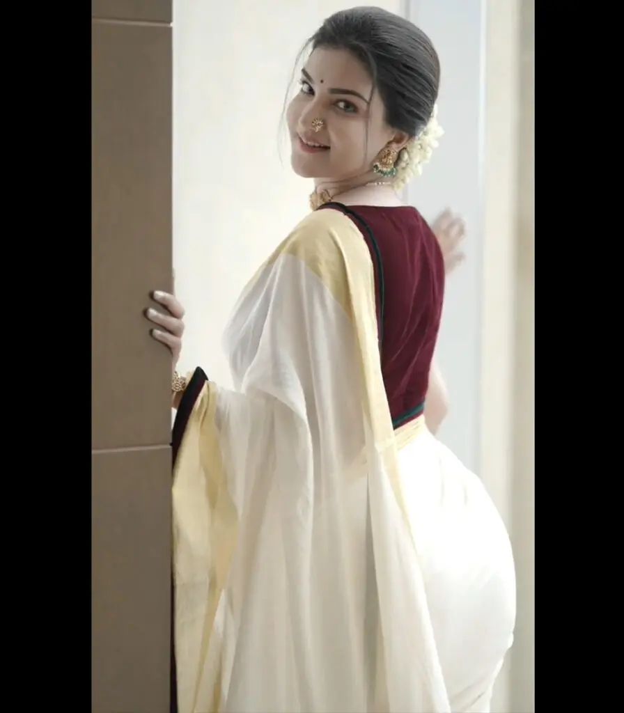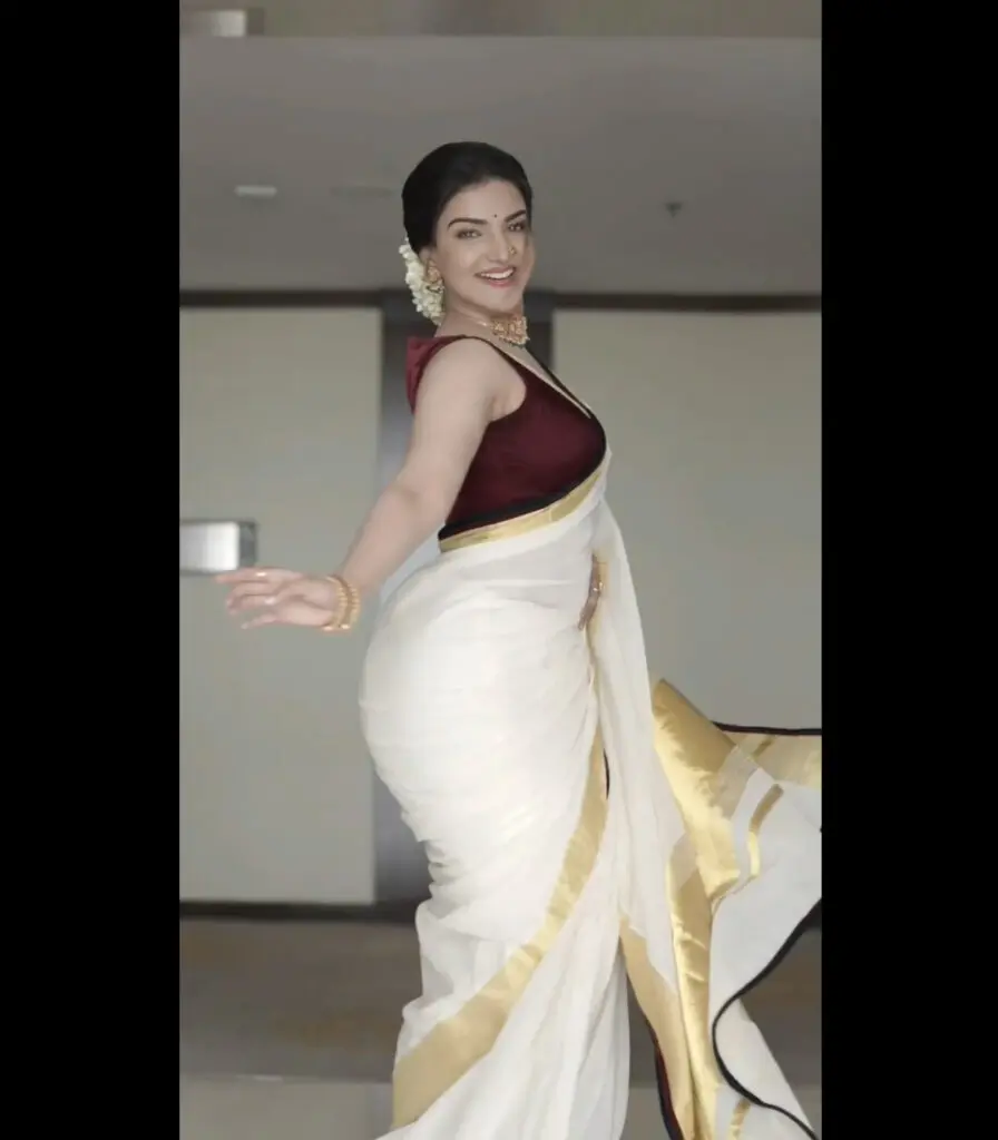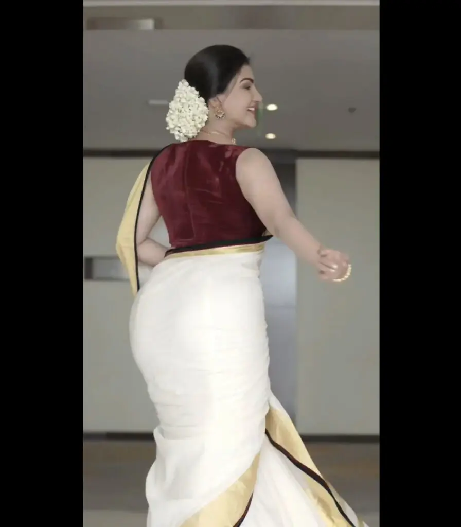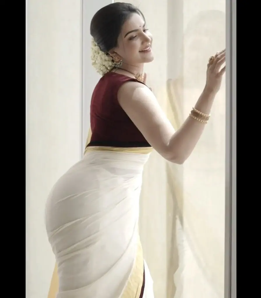 தற்போது வெள்ளை நிற புடவை அணிந்து கொண்டு தன்னுடைய எடுப்பான பின்னழகை தூக்கி காட்டி ரசிகர்களின் சூட்டை கிளப்பி விட்டுள்ளார்.