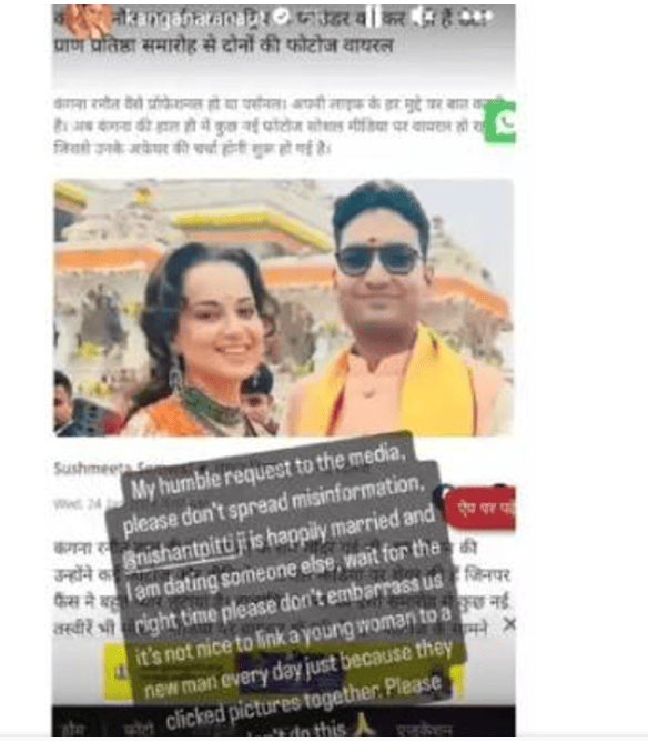 இந்நிலையில், சமீபத்தில் அயோத்தி ராமர் கோவில் குடமுழுக்கு விழாவில் ‘ஈஸி மை டிரிப்’ இணை நிறுவனர் நிஷாந்த் பிட்டியுடன் புகைப்படம் எடுத்திருந்தார். அது வெளியாகி கிசு கிசுக்கப்பட்டது. தவறான தகவலை பரப்பாதீர்கள் நிஷாந்த் ஜிக்கு ஏற்கனவே திருமணம் ஆகிவிட்டது. நான் வேறொரு டேட் செய்து வருகிறேன். அதை சரியான நேரம் வரும்போது நானே சொல்கிறேன். அதுவரை எங்களை இணைத்து வைத்து பேசாதீர்கள். ஒருவருடன் சேர்ந்து புகைப்படம் எடுத்துக்கொண்டேன் என்பதாலேயே அவருடன் இணைத்து பேசாதீர்கள் என கிசு கிசுவுக்கு முற்றுப்புள்ளி வைத்துள்ளார்.