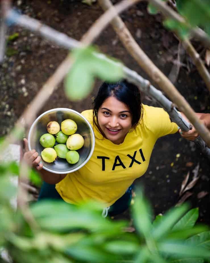 மேலும் சமூக வலைத்தளத்தில் சமீப காலமாக கவர்ச்சி புகைப்படங்களை வெளியிட்டு ரசிகர்களின் கவனத்தை இவர் பக்கம் திருப்பியுள்ளார். அந்தவகையில் தற்போது மஞ்சள் நிற Taxi என்ற பெயர் பொறிக்கப்பட்ட டீ ஷர்ட் அணிந்து கையில் கொய்யாப்பழங்களை வைத்து கொண்டு டாப் அங்கிள் போஸ் கொடுத்து ரசிகர்களை சூடேற்றியுள்ளார்.