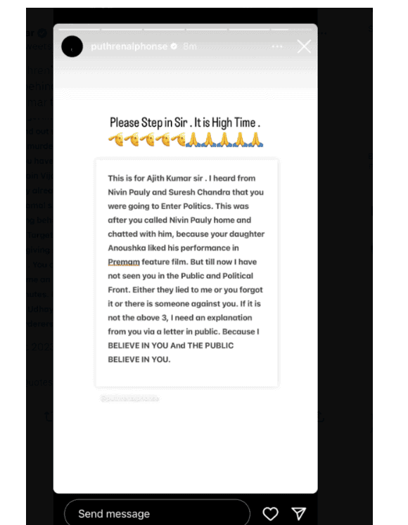 அதாவது அவரது பதிவில், அஜித் சாருக்கான பதிவு நிவின் பாலி மற்றும் சுரேஷ் சந்திரா மூலமாக நீங்கள் அரசியலுக்கு வரப்போவதாக அறிந்தேன். இது பிரேமம் படத்திற்கு பிறகு நீங்கள் நிவின்பாலியை உங்கள் வீட்டிற்கு அழைத்து பேசியதற்கு பிறகு நடந்தது. ப்ரேமம் படத்தில் நிவின் பாலியின் நடிப்பு அஜித்தின் மகளுக்கு பிடித்து இருந்ததால் அவரை வீட்டிற்கு அழைத்து அஜித் பேசினார்.