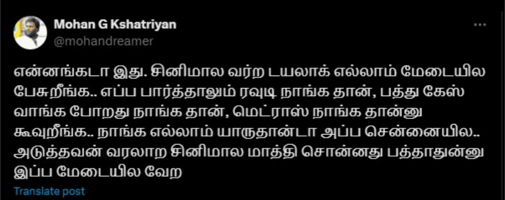 இந்நிலையில் இயக்குநர் பா. ரஞ்சித் பேச்சை குறிப்பிடும் வகையில் இயக்குநர் மோகன் ஜி தனது எக்ஸ் தளத்தில் ஒரு பதிவை போட்டுள்ளார்.