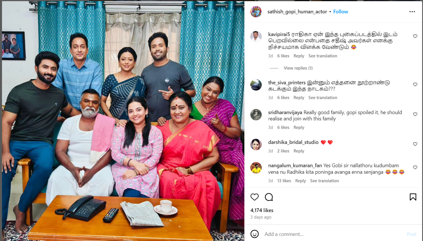 இந்த நிலையில், பாக்கியலட்சுமி சீரியலில் அட்டகாசமாக நடித்து வரும் கோபி என்கிற சதீஷ் தனது இன்ஸ்டாவில் ஒரு போட்டோவை வெளியிட்டுள்ளார். அதில், ராதிகா இல்லாமல் பாக்கிய குடும்பத்துடன் கோபி புகைப்படம் எடுத்துள்ளார். அதனை பார்த்த ரசிகர்கள் கோபி அப்ப ராதிகாவோட நிலைமை என்ன? பாக்கியா குடும்பத்துடன் சேர்ந்துகிட்டிங்களா என்று எல்லோரும் கேள்வி எழுப்பி வருகின்றனர். பாக்கியலட்சுமி தொடர் ஒருவேளை முடிவுக்கு வரப் போகிறதா என நிறைய கேள்விகளும் எழுப்பி வருகின்றனர். ஆனால், சதீஷ் சீரியல் முடியறதுக்கு வாய்ப்பே இல்லப்பா என்று தெரிவித்துள்ளார்.