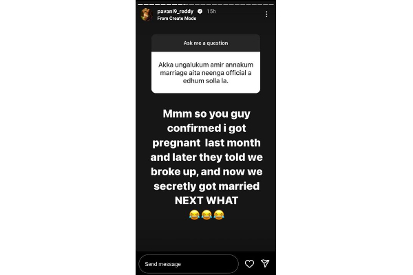 இந்நிலையில் இன்ஸ்டாகிராமில் “நீங்க ரகசிய திருமணம் செய்துக்கொண்டதை ஏன் வெளியில் சொல்லவில்லை? என்ற ரசிகரின் கேள்விகளுக்கு பதில் அளித்த பாவினி, கடந்த மாதம் நான் கர்ப்பமாக இருப்பதாக நீங்களே முடிவு செய்தீர்கள் அதன் பின்னர் நாங்கள் இருவரும் பிரிந்து விட்டதாக சொன்னார்கள் இப்போது நாங்கள் ரகசியமாக திருமணம் செய்துக்கொண்டோம் என்று சொல்லுகிறார்கள் அடுத்து என்ன, என்று பாவனி கேட்டுள்ளார்.