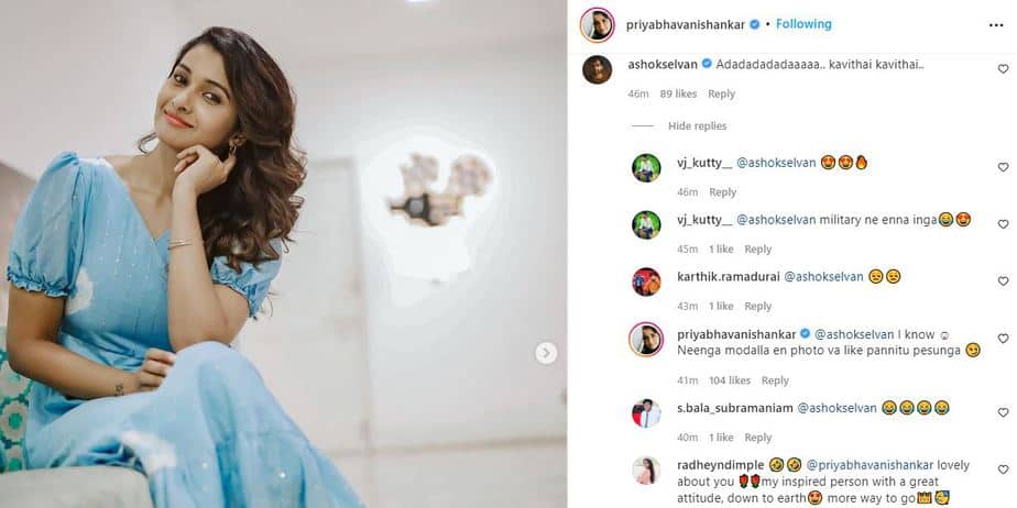 அந்த வகையில் தற்போது அழகான புகைப்படத்தினை பதிவிட்டிருந்தார். அந்த புகைப்படங்களுக்கு மன்மத லீலை படத்தில் நடித்தன் மூலம் ப்ளே பாய் நடிகராக உயர்ந்த அசோக் செல்வன் அந்த புகைப்படங்களுக்கு கமெணட் செய்திருந்தார். உடனடியாக பிரியா பவானி சங்கர், அசோக் செல்வனை நோஸ் கட் செய்யும் விதமாக “முதல்ல என் போட்டோவுக்கு லைக் பண்ணிட்டு பேசுங்க” என கூறி அவரை நோஸ் கட் செய்தார். இதனை பார்த்த ரசிகர்கள் அசோக் செல்வனை கலாய்த்து வருகின்றனர்.