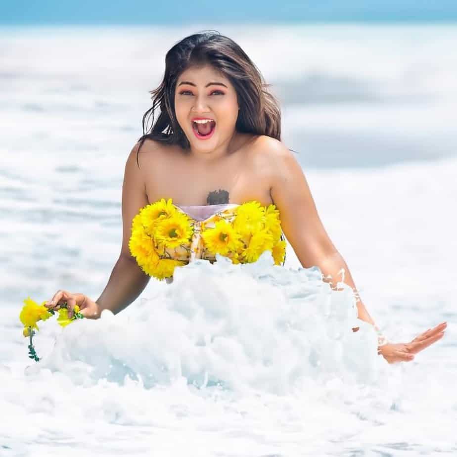 இப்போது சொட்ட சொட்ட நனைந்து உடலோடு ஒட்டிய உடை அணிந்து கொண்டு இவர் தன்னுடைய தொடையழகை காட்டி ரசிகர்களை கடத்தியுள்ளார்.