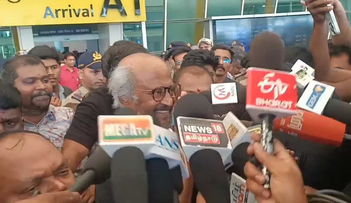 தொடர்ந்து விமான நிலையத்தில் திரண்டு இருந்த ரசிகர்களை உற்சாகப்படுத்தும் விதமாக காரில் ஏறி ரஜினிகாந்த் கை காண்பிக்கவே அங்கிருந்த ரசிகர்கள் தலைவா தலைவா என முழக்கமிட்டு உற்சாகமடைந்தனர்.