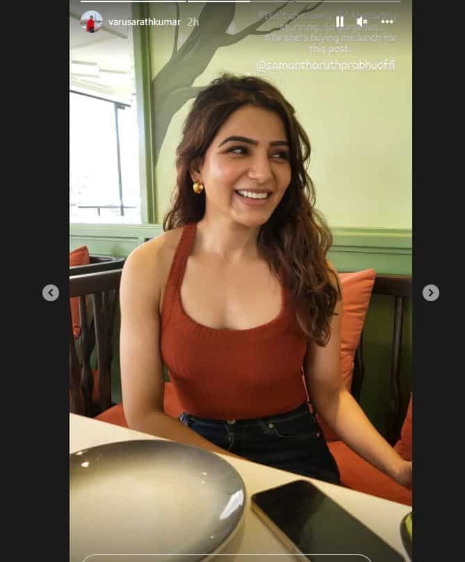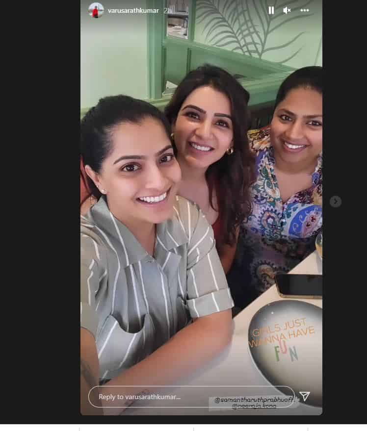 வரலட்சுமி சரத்குமார் நடித்த படங்களிலேயே ‘தாரை தப்பட்டை’ ,’சண்டக்கோழி 2 ‘ , ‘சர்கார் ‘,’விக்ரம் வேதா ‘ ஆகிய படங்கள் மக்களை பெரிதும் கவர்ந்த படங்களாகும். இவர் அடிக்கடி தனது புகைப்படங்களை தனது இன்ஸ்டாகிராம் பக்கத்தில பதிவிடுவதை வழக்கமாக கொண்டுள்ளார். அந்த வகையில், சமந்தாவுடன் இருக்கும் புகைப்படத்தின் அவரது இன்ஸ்டாகிராம் ஸ்டோரியில் பதிவிட்டுள்ளார். இந்த புகைப்படத்தில் நடிகை சமந்தா மிகுந்த உற்சாகத்துடனயே காணப்படுகிறார். இதனால் சமந்தா ரசிகர்கள் மகிழ்ச்சியடைந்துள்ளனர்.