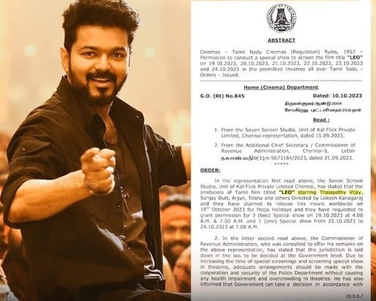 பின்னர் இதுகுறித்து அரசாணை வெளியிட்டுள்ள தமிழக அரசு, விஜய்யின் லியோ படம் தமிழகத்தில் முதல் 5 நாட்களுக்கு சிறப்புக் காட்சி அனுமதி வழங்கப்பட்டுள்ளது. அதன்படி மாநிலம் முழுவதும் ஒரு நாளைக்கு 5 காட்சிகள் வெளியிடப்படும். அதன்படி அக்டோபர் 19 முதல் 24 வரை 5 காட்சிகள் வெளியிடலாம். ஆனால், அதிகாலை 4 மணி காட்சி திரையிட அனுமதி வழங்கவில்லை என்பது குறிப்பிடதக்கது.