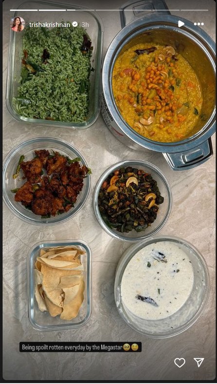 நடிகை திரிஷா தற்போது விஜய்யுடன் கோட் திரைப்படத்தில் ஒரு குத்தாட்ட பாடலுக்கு ஆட்டம் போடுகிறார். மேலும் அஜித்துடன் குட் பேட் அக்லி திரைப்படத்திலும் கமல்ஹாசனின் தக்லைஃப் திரைப்படத்திலும் நடித்த வருகிறார். இந்த நிலையில் தெலுங்கு சினிமாவில் சிரஞ்சீவிக்கு ஜோடியாக “விஸ்வாம்பரா” என்ற படத்தில் நடித்து வருகிறார். இப்படத்தின் ஷூட்டிங்கில் பங்கேற்று வரும் நடிகை திரிஷா தனக்கு மெகா ஸ்டார் சிரஞ்சீவி வீட்டில் இருந்து தினமும் உணவு அனுப்புகிறார் என கூறி வகை வகையான சாப்பாடு புகைப்படத்தை வெளியிட்டு உள்ளார்.