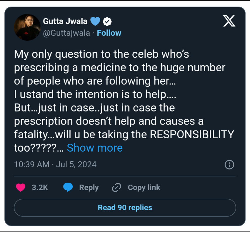 நீங்கள் சொல்வதுபடி யாராவது செய்து உயிர் போனால் நீங்கள் பொறுப்பு ஏற்பீர்களா என நடிகர் விஷ்ணு விஷாலின் மனைவி ஜுவாலா கட்டாவும் சமந்தாவின் பெயரை குறிப்பிடாமல் ட்வீட் செய்தார்.