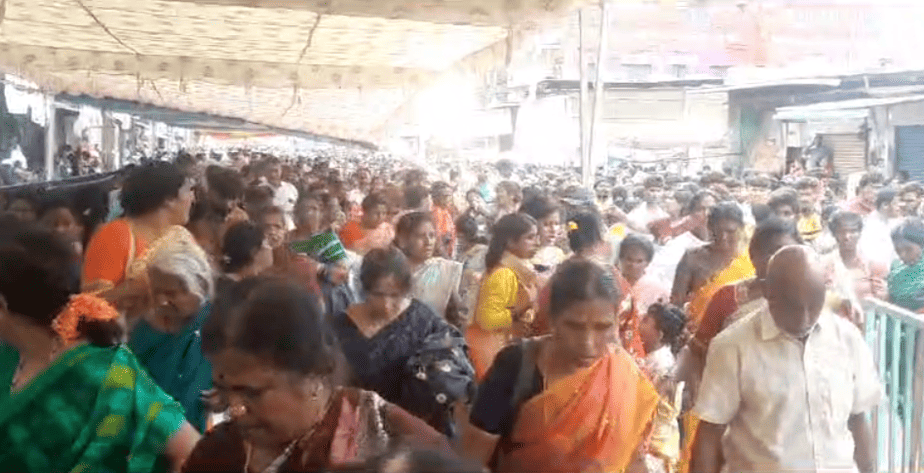 இதில் தள்ளுமுள்ளு ஏற்பட்டு பலர் கீழே விழுந்து நெருசலில் சிக்கிக்கொண்டனர். உடனடியாக கோவில் நிர்வாகிகள் கூட்டத்தை கட்டுப்படுத்தி கீழே விழுந்தவர்களை ஒவ்வொருவராக மீட்டு மருத்துவமனைக்கு அனுப்பி வைத்தனர்.