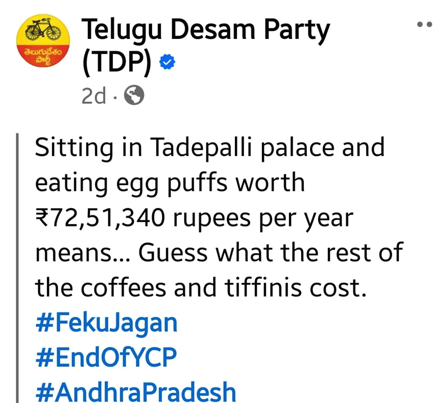 இதுதவீர டிபன், காபி இதர செலவுகள் தனி என சமூக வலைதளங்களில் தெலுங்கு தேசம் கட்சியினர் ஒய்.எஸ்.ஆர் காங்கிரஸ் கட்சி மீது குற்றம்சாட்டு பதிவு செய்துள்ளனர்.