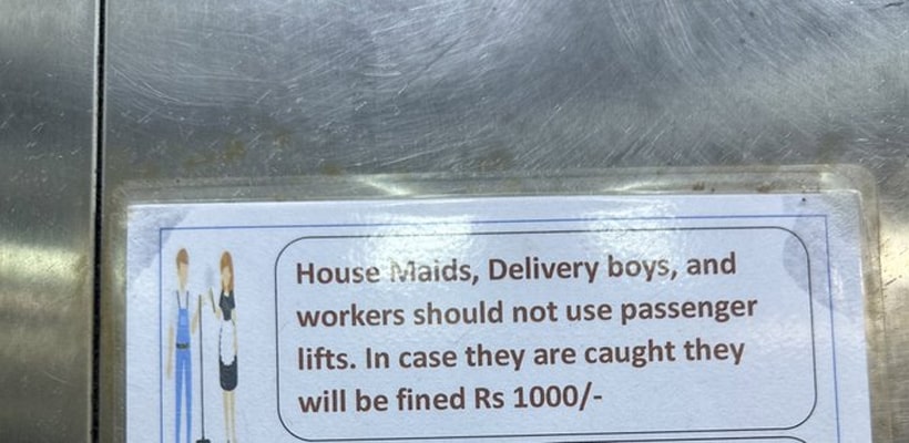 ஆந்திர மாநிலம் ஐதராபாத்தில் அமைந்துள்ள ஹவுசிங் சொசைட்டி ஒன்று, தங்களின் குடியிருப்புகளுக்கு வரும் வீட்டு பணியாளர்கள் மற்றும் டெலிவரி பாய்ஸ் உள்ளிட்டோர் லிஃப்ட் பயன்படுத்தக் கூடாது என்றும், மீறினால் ரூ.1000 அபராதம் செலுத்த வேண்டும் என்று நோட்டீஸ் ஒட்டப்பட்டுள்ளது.