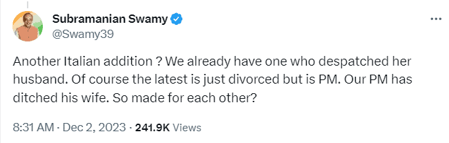 இந்த நிலையில், பிரதமர் மோடி மற்றும் இத்தாலி பிரதமர் மெலோனியின் செல்பி புகைப்படத்தை பகிர்ந்த முன்னாள் மத்திய அமைச்சர் சுப்பிரமணிய சுவாமி, இருவரும் made for each other என பதிவிட்டிருப்பது பெரும் சர்ச்சையை ஏற்படுத்தியுள்ளது.