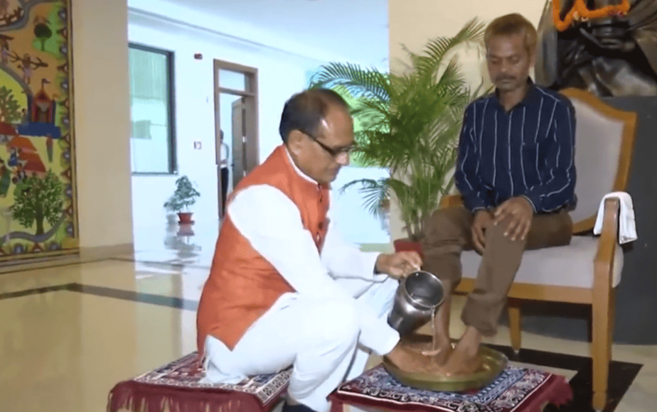 மத்தியபிரதேசத்தில் முகத்தில் சிறுநீர் கழித்த சம்பவத்தில் பாதிக்கப்பட்டவரை தனது வீட்டிற்கே அழைத்து அவரது கால்களை முதலமைச்சர் சுத்தம் செய்த நிகழ்வு அரங்கேறியுள்ளது.