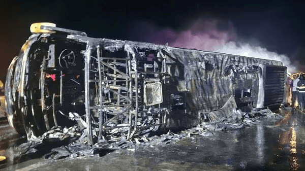 இதில் பேருந்து முழுவதும் எரிந்ததில், அதனுள் இருந்த பயணிகளில் 26 பேர் பரிதாபமாக உயிரிழந்தனர். மேலும், சிலர் பேர் படுகாயங்களுடன் மருத்துவமனையில் சிகிச்சைக்காக அனுமதிக்கப்பட்டனர்.