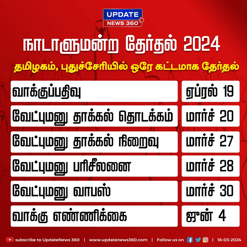 தமிழகம் மற்றும் புதுச்சேரிக்கு ஏப்ரல் 19ம் தேதி ஒரே கட்டமாக தேர்தல் நடைபெற இருக்கிறது. வேட்புமனு தாக்கல் மார்ச் 20ம் தேதி தொடங்குகிறது. வேட்புமனு தாக்கல் மார்ச் 27ம் தேதி நிறைவடைகிறது. வேட்புமனு பரிசீலனை மார்ச் 28ம் தேதி நடக்கிறது. வேட்புமனு வாபஸ் மார்ச் 30ம் தேதி செய்யலாம்.