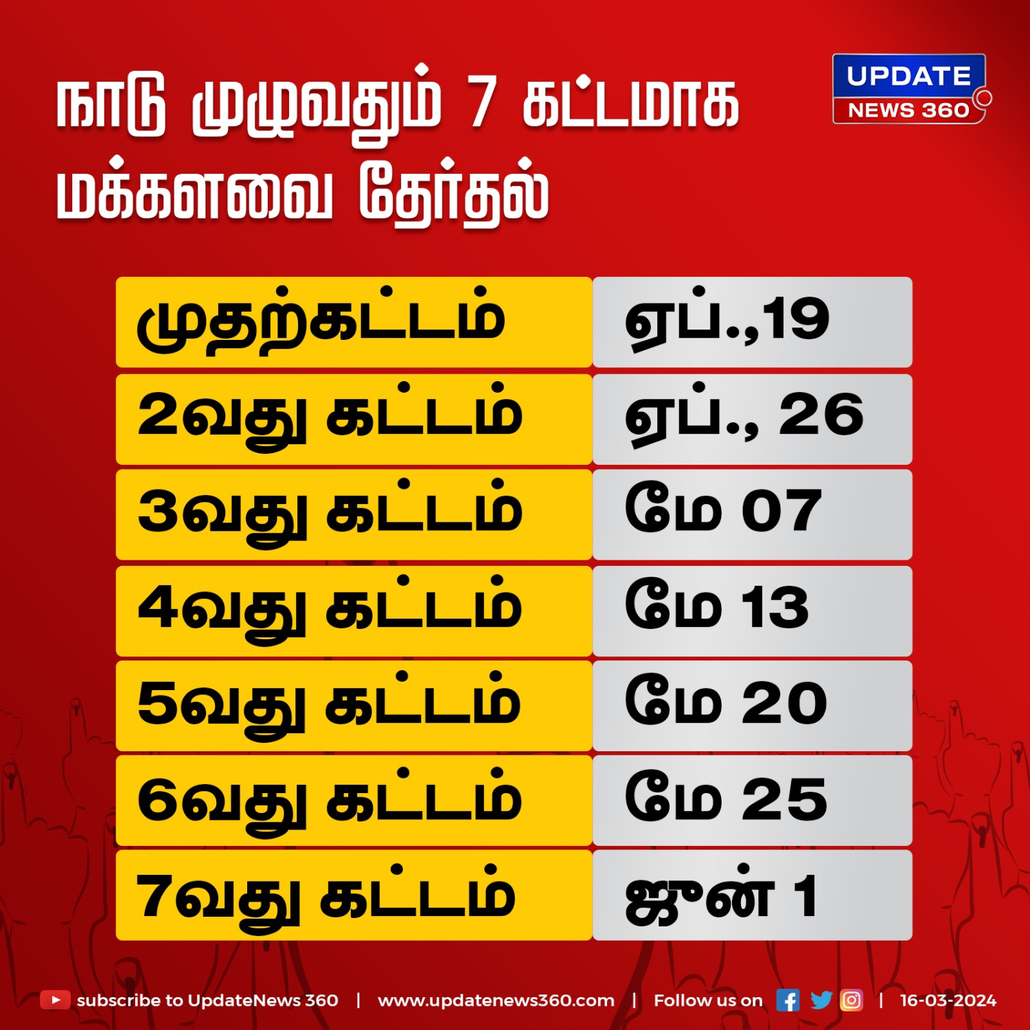நாடு முழுவதும் 7 கட்டமாக மக்களவை தேர்தல் நடைபெறுகிறது. முதற்கட்டம் – ஏப்.,19, 2வது கட்டம் – ஏப்ரல் 26, 3வது கட்டம் – மே 07, 4வது கட்டம் – மே 13, 5வது கட்டம் – மே 20, 6வது கட்டம் – மே 25, 7வது கட்டம் – ஜுன் 1 ஆகிய தேதிகளில் நடக்கிறது. தமிழகத்தில் காலியாக உள்ள விளவங்கோடு தொகுதிக்கு ஏப்ரல் 19ம் தேதி இடைத்தேர்தல் நடைபெறுகிறது. என தெரிவித்தார்.