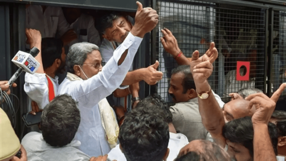 சாலையில் அமர்ந்து போராட்டத்தில் ஈடுபட்ட சித்தராமையா உள்ளிட்ட காங்கிரஸ் கட்சியினரை கர்நாடக காவல்துறையினர் குண்டுக்கட்டாகக் கைது செய்து வண்டியில் ஏற்றிச் சென்றனர்.
