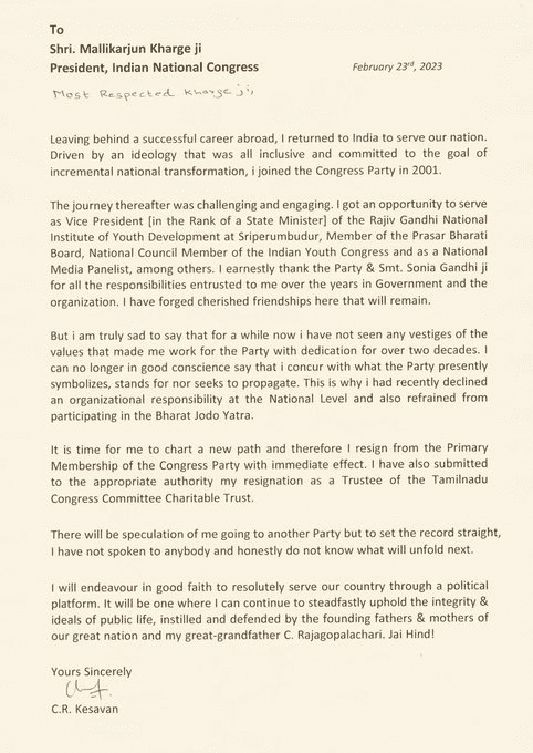 சமீபத்தில் நடந்து முடிந்த ராகுலின் பாரத ஒற்றுமை யாத்திரையிலும் பங்கேற்றார். இந்த நிலையில் இன்று காங்கிரசில் இருந்து விலகுவதாக கேசவன் அறிவித்து உள்ளார் காங்கிரஸ் கட்சியில் இருந்தும், அறக்கட்டளை பொறுப்பில் இருந்தும் ராஜினாமா செய்துள்ளார்.