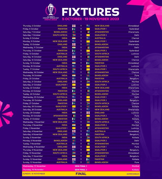 50 ஓவர் உலகக்கோப்பை கிரிக்கெட் தொடருக்கான போட்டி அட்டவணை வெளியாகியுள்ளது.