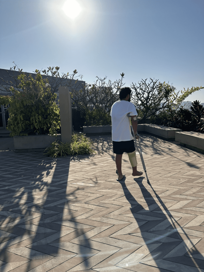 கம்பூன்றி நடப்பது போல் உள்ள அந்த புகைப்படத்தை பார்த்து மகிழ்ச்சி அடைந்துள்ள ரசிகர்கள் விரைவில் களம் திரும்ப வேண்டும் என்று வாழ்த்தி பதிவிட்டு வருகிறார்கள்.