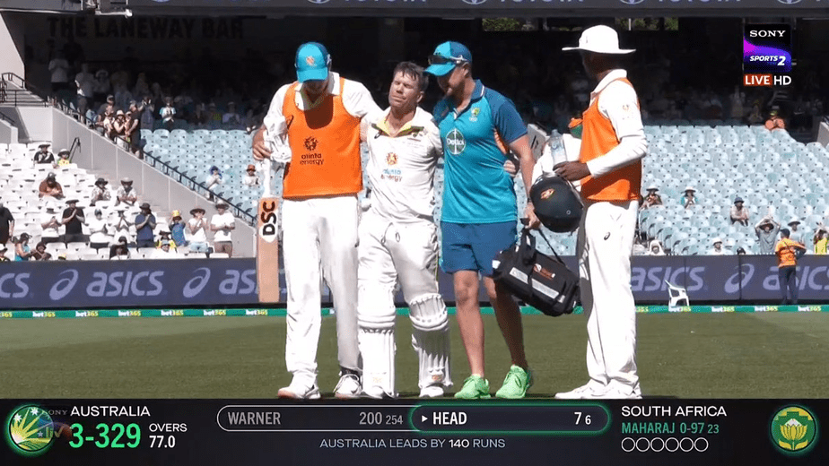 இரட்டை சதம் அடித்து அதனை வார்னர் கொண்டாடிய போது, அவருக்கு தசை பிடிப்பு ஏற்பட்டது. இதனால், அவர் மேற்கொண்டு விளையாட முடியாத நிலை உருவானது. பின்னர், அவர் ரிட்டையர்டு ஹர்ட் ஆகி வெளியேறினார். இது அவரது ரசிகர்களை சோகத்தில் ஆழ்த்தியது.
