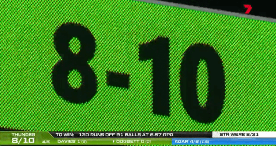 அந்த அணியில் 5 வீரர்கள் டக் அவுட்டும், 3 வீரர்கள் ஒரு ரன்னும் எடுத்தனர். சிட்னி தண்டர்ஸ் அணியின் பவுலர் டக்கெட் மட்டும் ஒரு பவுண்டரி அடித்தார். அடிலெய்டு ஸ்டிரைக்கர் அணி தரப்பில் ஹென்ரி தோர்ன்டன் 5 விக்கெட்டும், அகர் 4 விக்கெட்டும், ஷார்ட் ஒரு விக்கெட்டையும் கைப்பற்றினர்.