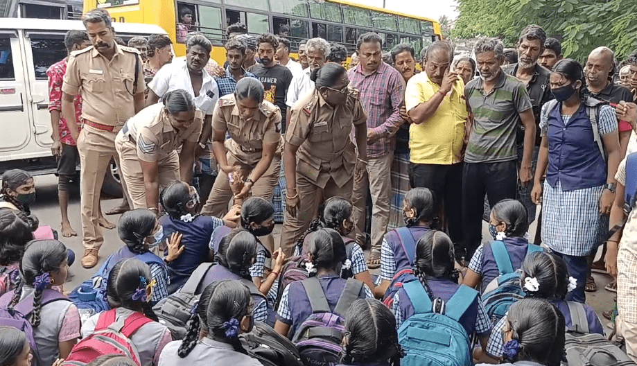 அரசுப் பள்ளி மாணவிகள் திடீர் சாலை மறியல்.. செய்தி சேகரிக்க சென்ற செய்தியாளர்களை அடிக்க பாய்ந்த டிஎஸ்பி : பழனியில் பரபரப்பு!!