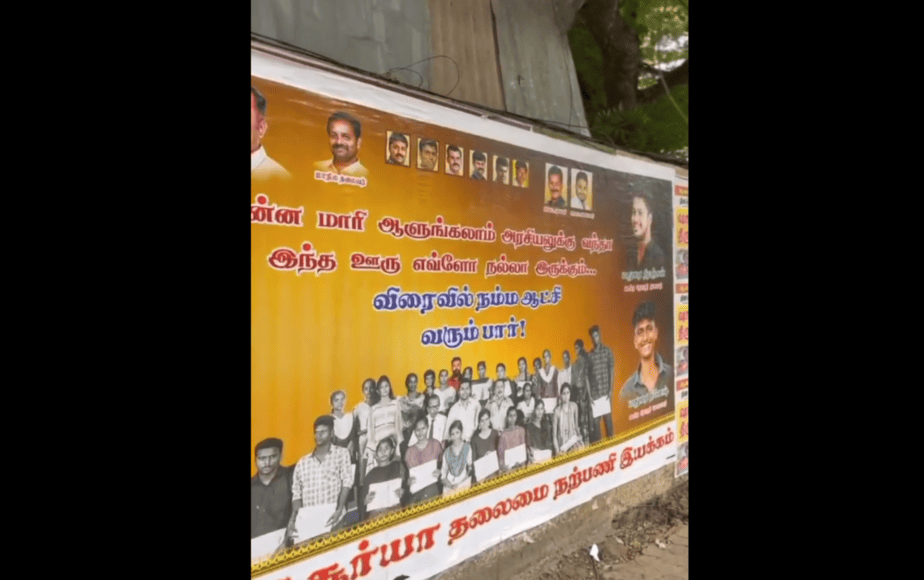 அதில் “உன்ன மாரி ஆட்கள் எல்லாம் அரசியலுக்கு வந்தா, இந்த ஊரு எவ்வளவு நல்லா இருக்கும் விரைவில் நம்ம ஆட்சி வரும் பார்” என தெரிவித்தும் வாசகத்தின் பக்கத்தில் தமிழ்நாடு சட்டமன்றம் முன்பாக நடிகர் சூர்யா பேசுவது போன்ற காட்சி அமைத்து போஸ்டர் அடித்து மதுரை நகர் பகுதியில் ஒட்டியுள்ளனர்.