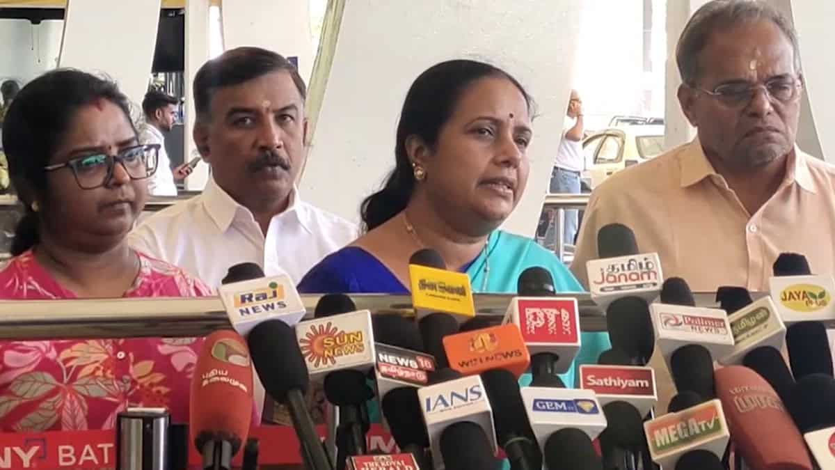 கோவை விமான நிலையத்தில் பாஜக தேசிய மகளிர் அணி தலைவர் வானதி சீனிவாசன் செய்தியாளர்களை சந்தித்தார்.
