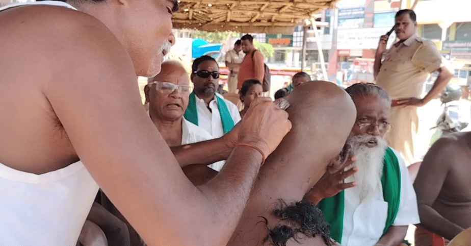 இந்நிலையில், 45வது நாளாக இன்று விவசாயிகள் மத்திய அரசு விவசாயிகளுக்கு மொட்டை அடித்து விட்டதாக கூறி மொட்டை அடிக்கும் போராட்டத்தில் விவசாயிகள் ஈடுபட்டனர். மேலும், 2016ல் வறட்சியின் பொழுது பெரிய விவசாயிகள் வாங்கிய கடனை தள்ளுபடி செய்யுங்கள் என்று உயர்நீதிமன்றம் கூறிய பிறகு, பெரிய விவசாயிகள் வாங்கிய குறுகிய கால கடனை விவசாயிகளின் கையெழுத்தை பெறாமலே போலியாக கையெழுத்தை போட்டு மத்திய கால கடனாக அதிமுக அரசு மாற்றி வைத்தது, ஆகையால் விவசாய கடனை தள்ளுபடி செய்து விவசாயிகளை காப்பாற்ற வேண்டுகிறோம்.