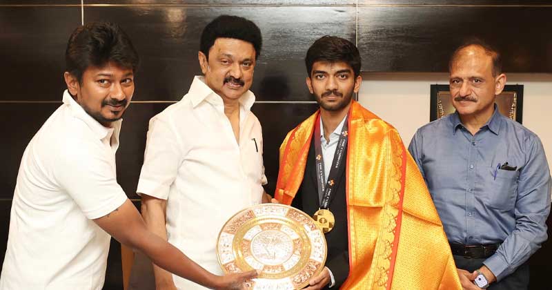அப்போது தமிழக முதல்வர் ஸ்டாலின் மற்றும் விளையாட்டு துறை அமைச்சரான உதயநிதி ஸ்டாலின் இருவரும் செஸ் வீரர் குகேஷுக்கு அவர்களது வாழ்த்துக்களை தெரிவித்துள்ளனர். மேலும், குகேஷுக்கு 75 லட்சம் ரூபாய் ஊக்கத்தொகைக்கான காசாலையை முதல்-அமைச்சர் மு.க.ஸ்டாலின் வழங்கி உள்ளார்.