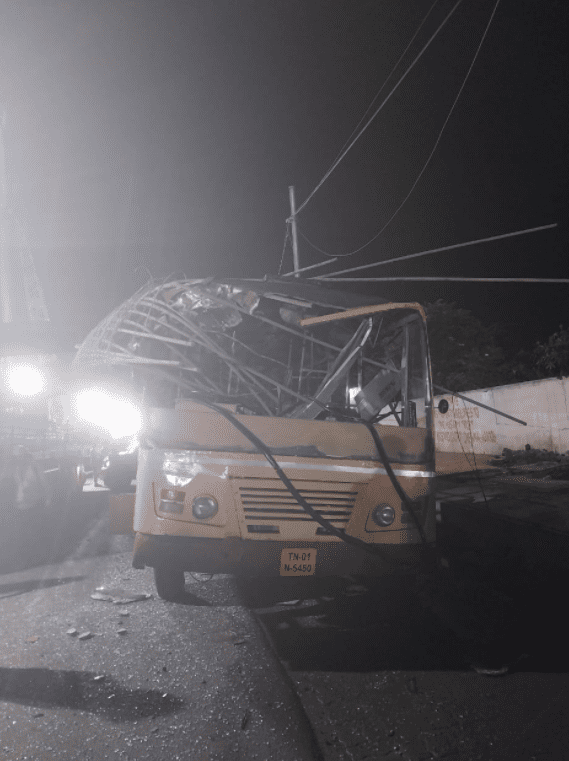 இன்று காலை குன்றத்தூரில் இருந்து அரசு பேருந்து TN01 N5450 என்ற அரசு பேருந்து 8 அரசு பேருந்து பணியாளர்களை ஆலந்தூர் அழைத்துச் சென்று கொண்டிருந்தது. அப்போது ராமபுரம் பகுதியில் மெட்ரோ மேம்பால பணி நடந்து கொண்டிருந்தது. எதிர்பாராத விதமாக கிரேனில் இருந்த பில்லர் தவறி, சாலையில் சென்று கொண்டிருந்த பேருந்து மற்றும் லாரி மீது விழுந்தது.