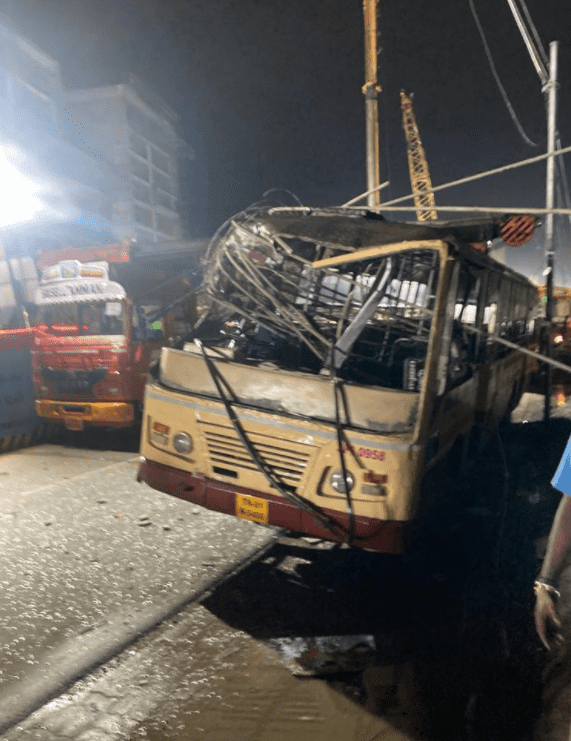 மெட்ரோ மேம்பால பில்லர் சாய்ந்து விழுந்து விபத்து : அப்பளம் போல நொறுங்கிய அரசுப் பேருந்து… அதிர்ஷ்டசமாக உயிர் தப்பிய அரசு ஊழியர்கள்!