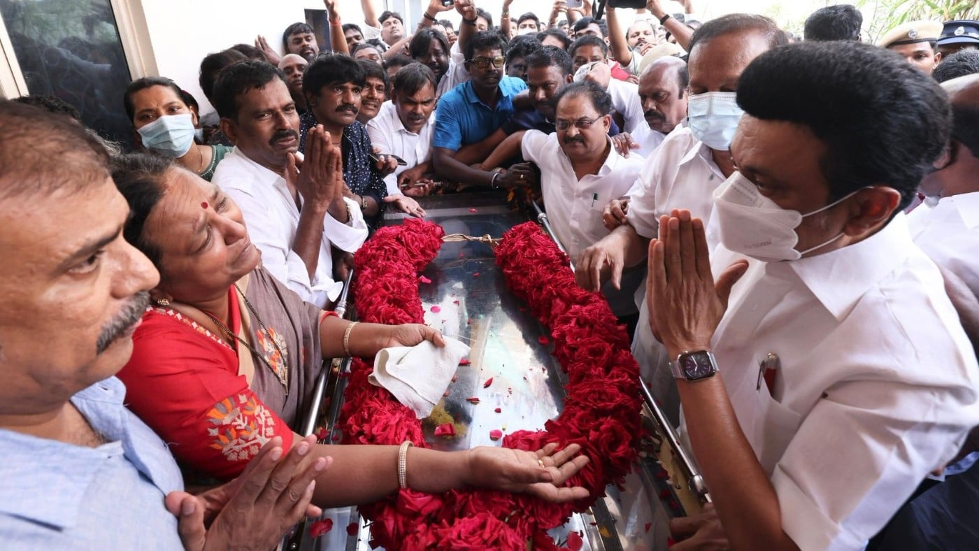 இந்நிலையில் சற்றுமுன் மறைந்த தேமுதிக தலைவர் விஜயகாந்த் உடலுக்கு நேரில் அஞ்சலி செலுத்தியுள்ளார் தமிழக முதலவர் முக ஸ்டாலின். அப்போது விஜயகாந்தின் மனைவி பிரேமலதா தன் துக்கத்தை முதல்வரிடம் கூறி கதறி அழுத கோரமான புகைப்படங்கள் இணையத்தில் வெளியாகி மனதை வருடுகிறது. முன்னதாக முதல்வர் முக ஸ்டாலின் மறைந்த விஜயகாந்த் உடலின் இறுதிப் பயணத்திற்கு முழு அரசு மரியாதை அளிக்கப்படும் என அறிவித்திருந்தது குறிப்பிடத்தக்கது.