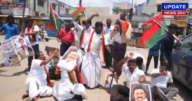திருச்சி உறையூர் நாச்சியார் கோவில் அருகில் புதிய தமிழக மாநில கொள்கை பரப்பு துணை பொதுச்செயலாளர் வாழையூர் குணா தலைமையில் 20க்கும் மேற்பட்டோர் திடீரென தமிழக முதல்வர் மு.க.ஸ்டாலின் உருவ பொம்மையை எரித்து போராட்டத்தில் ஈடுபட்டனர். இதைத்தொடர்ந்து சம்பவ இடத்திற்கு வந்த காவல்துறையினர் அவர்களை கைது செய்தனர்.
