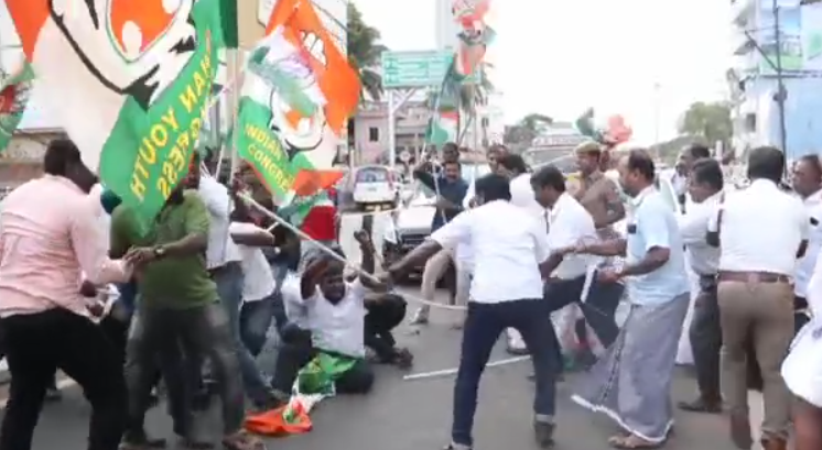 இதனால் பரபரப்பு ஏற்பட்டது. பின்னர் அங்கிருந்து பாஜகவினர் திரண்டு வந்து வாக்குவாதத்தில் ஈடுபட்டு காங்கிரஸ் கட்சியை சேர்ந்தவர்களை அவர்கள் கொண்டுவந்த காங்கிரஸ் கொடிகளை கொண்டு அடித்து விரட்டினர்.