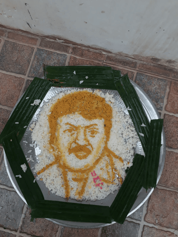 அதேபோல் குனியமுத்தூர் பகுதியை சேர்ந்த UMT ராஜா என்ற நகை வடிவமைப்பு கலைஞர் “பசியாறும் சோறில் விஜயகாந்த்” என்ற தலைப்பில் சாப்பாட்டில் மஞ்சள் பொடியை கொண்டு விஜயகாந்த் உருவத்தை வரைந்துள்ளார்.