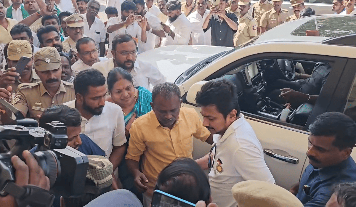 அப்போது, கோவை விமான நிலையம் வந்த உதயநிதி ஸ்டாலினுக்கு திமுக தொண்டர்கள் உற்சாக வரவேற்பு அளித்தனர். ஏராளமான தொண்டர்கள் குவிந்து இருந்தால் தள்ளுமுள்ளு ஏற்பட்டது.