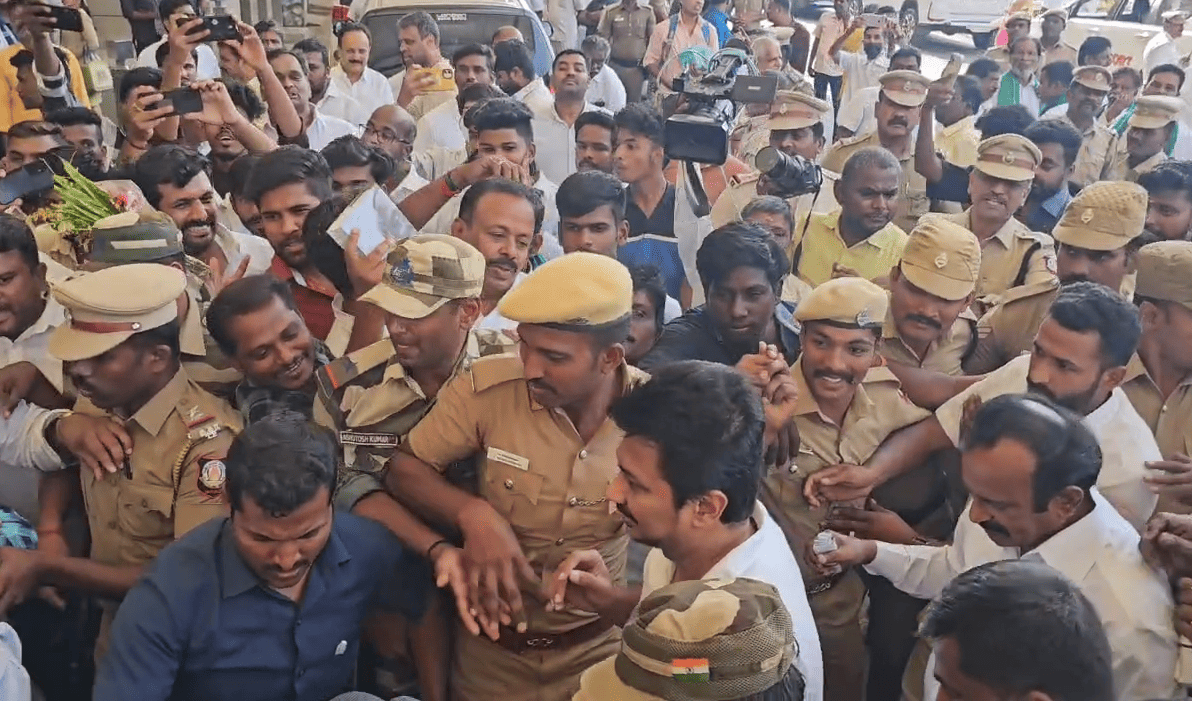 அப்போது, கோவை விமான நிலையம் வந்த உதயநிதி ஸ்டாலினுக்கு திமுக தொண்டர்கள் உற்சாக வரவேற்பு அளித்தனர். ஏராளமான தொண்டர்கள் குவிந்து இருந்தால் தள்ளுமுள்ளு ஏற்பட்டது.
