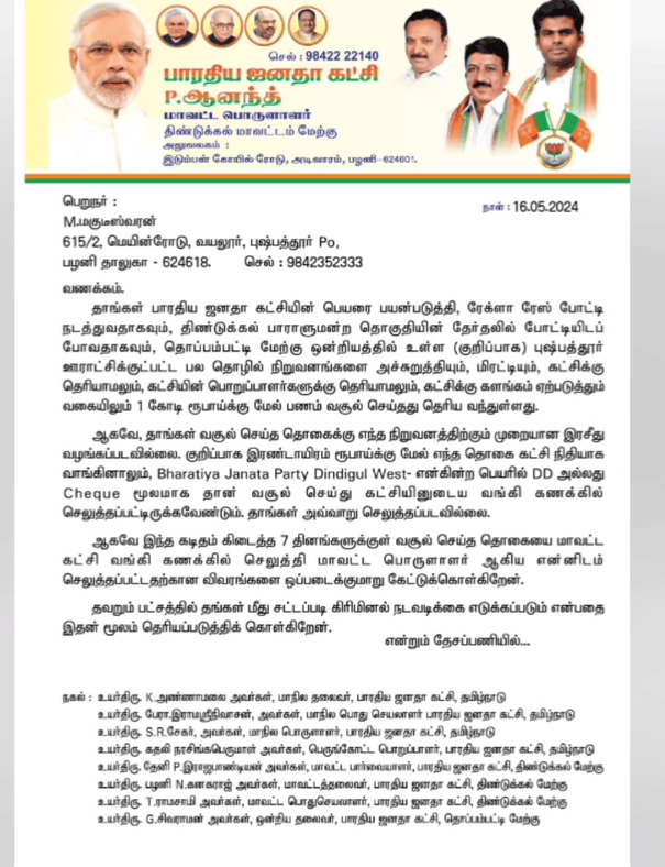 இது தொடர்பாக திண்டுக்கல் மாவட்ட பாஜக பொருளாளர் ஆனந்த் என்பவர் மகுடீஸ்வரனுக்கு கடிதம் அனுப்பி விளக்கம் கேட்டு உள்ளார். அந்தக் கடிதத்தில் பாரதிய ஜனதா கட்சி பெயரை பயன்படுத்தி ரேக்ளா பந்தயம் நடத்தப் போவதாகவும், திண்டுக்கல் தொகுதியில் போட்டியிட போவதாகவும் கூறி ஒரு கோடிக்கு மேல் பணம் வசூல் செய்தது தெரியவந்துள்ளது. இந்த கடிதம் கிடைத்து ஏழு நாட்களில் பாரதிய ஜனதா கட்சி திண்டுக்கல் மாவட்டம் என்ற வங்கிக் கணக்கில் பணத்தை செலுத்த வேண்டும். உரிய ஆவணங்களை மாவட்ட பொருளாளர் ஆனந்திடம் ஒப்படைக்க வேண்டும் எனவும், தவறினால் சட்டப்படி நடவடிக்கை எடுக்கப் போவதாக மாவட்ட பொருளாளர் ஆனந்த் அனுப்பிய கடிதத்தில் குறிப்பிட்டுள்ளார்.