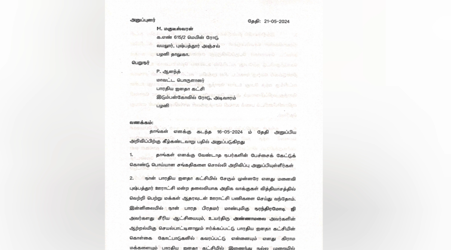 இதற்கு பதில் அளித்துள்ள முன்னாள் பாஜக நிர்வாகி மகுடீஸ்வரன், நான் கட்சியில் சேரும் முன்னே எனது மனைவி புஷ்பத்தூர் ஊராட்சி மன்ற தலைவியாக உள்ளார் என்றும், கட்சியில் எனது சொந்த பணத்தை தான் செலவு செய்து வந்துள்ளேன் என்றும், தன் மீது உள்ள காழ்புணர்ச்சி காரணமாக கடிதம் என் மீது அனுப்பப்பட்டுள்ளதாகவும், பாஜக மாவட்ட நிர்வாகிகள் கட்சியில் சேரும் முன்பு இருந்த சொத்தையும் தற்போது உள்ள சொத்தையும் மதிப்பிட்டு பார்த்தால் தெரியும் என பரபரப்பான ஒரு குற்றச்சாட்டையும். அந்த விளக்க கடிதத்தில் முன் வைத்துள்ளார்.
