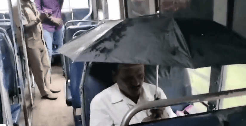 திண்டுக்கல்லில் அரசு பேருந்தின் மேற்கூரைப் பகுதியில் இருந்து மழை நீர் விழுந்ததால், குடைப்பிடித்தவாறு பேருந்தில் பயணம் செய்த பயணிகளின் வீடியோ சமூக வலைத்தளங்களில் வைரலாகி வருகிறது.