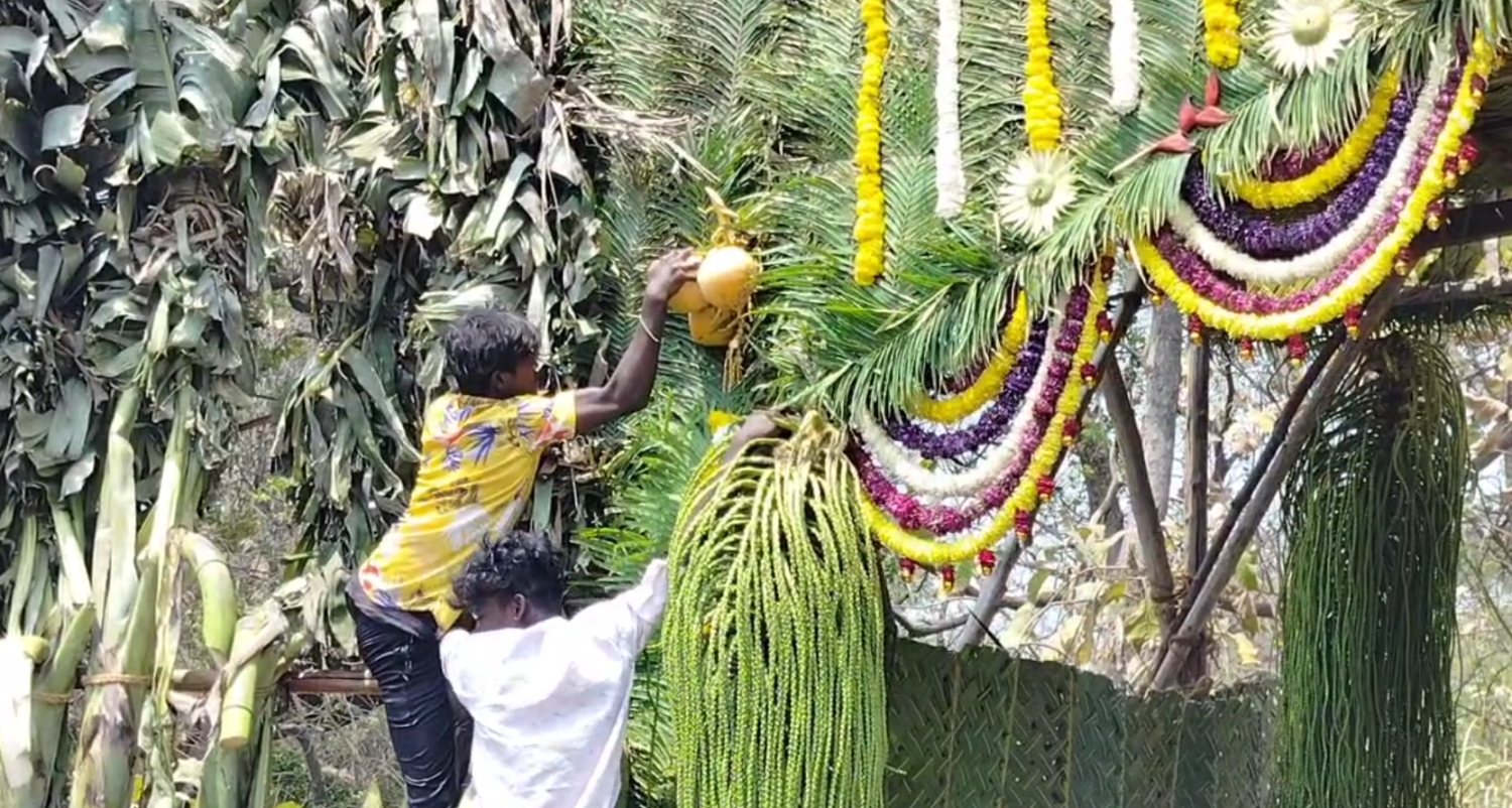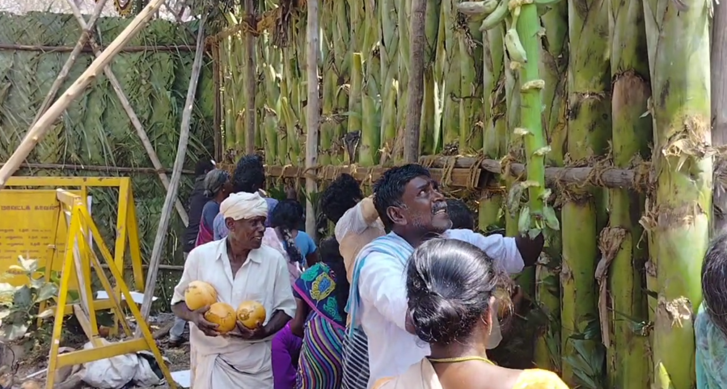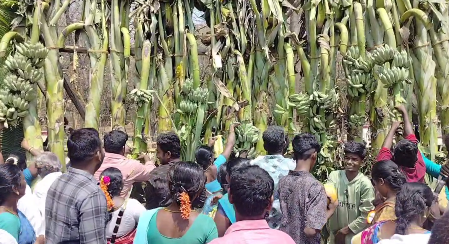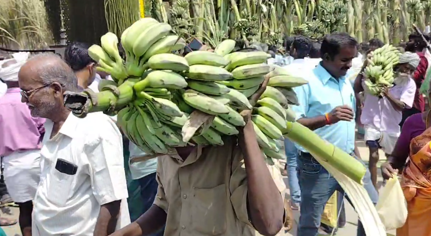 அதை தொடர்ந்து, நிகழ்ச்சி முடிந்து முதல்வரின் கார் முகப்பு வாயிலை கடந்து சென்ற மறுக்கணமே கையிலிருந்த கத்தி, ஆக்ஷாபிளேடு உள்ளிட்டவைகளை கொண்டு வாழைத்தார்கள், கரும்பு மற்றும் இளநீர் தேங்காய்களை பறித்து கொண்டு பாகுபலி படத்தில் ஆற்றைக் கடக்கும் போது குழந்தை பாகுபலி சிவகாமி பெற்ற கையில் தூக்கிச் செல்வது போன்று பறித்த பொருட்களை தூக்கி சென்றனர்.