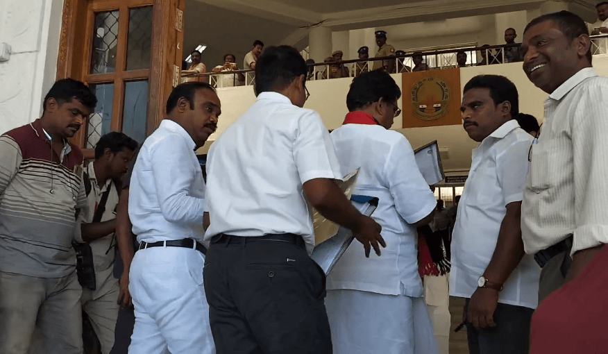 அமைச்சர்களுடன் தங்க தமிழ்ச்செல்வன் வேட்பு மனுக்காக காத்திருந்த நிலையில் தனது உதவியாளர்கள் இருசக்கர வாகனத்தில் வேட்பு மனுவை எடுத்து வந்தனர் எடுத்து வந்தனர். பின்னர் தேர்தல் நடத்தும் அலுவலரிடம் தனது வேட்பு மனுவை தாக்கல் செய்தார். இதனால் சிறிது நேரம் பரபரப்பு ஏற்பட்டது.