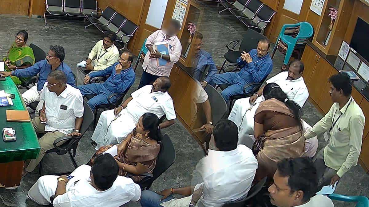 அந்த புகாரின் பேரில் விசாரணை செய்ததில் அரசு ஊழியர் தானாகவே காலில் விழுந்து மன்னிப்பு கேட்கும் சிசிடிவி காட்சிகள் வெளியாகியுள்ளன.