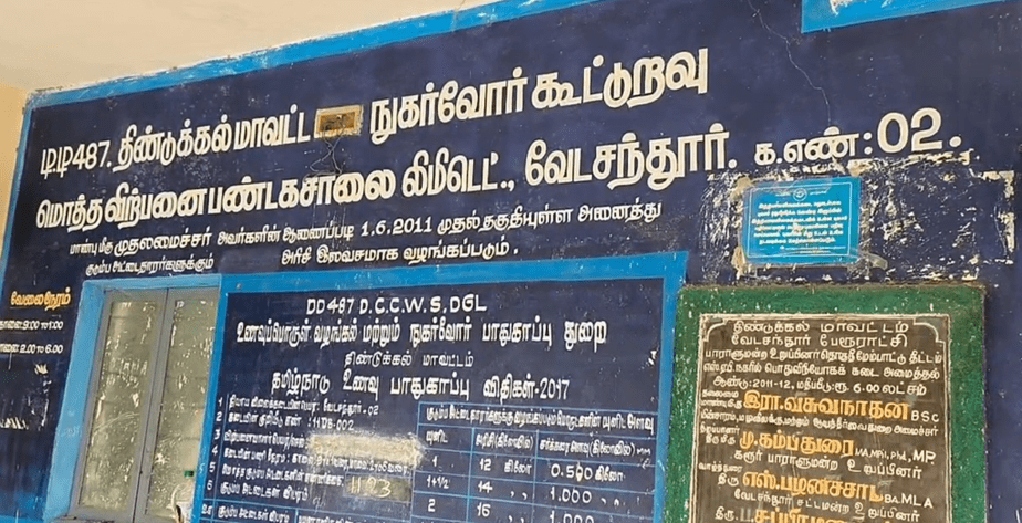 திண்டுக்கல் மாவட்டம் வேடசந்தூர் தாலுகா டிடி 487 திண்டுக்கல் மாவட்ட நுகர்வோர் மொத்த விற்பனை பண்டக சாலையில் சேல்ஸ் மேலாளராக பணியாற்றுபவர் மேனகா (32). இந்த நுகர்வோர் பண்டகால சாலையில் மொத்தம் 1233 ரேஷன் கார்டுகள் உள்ளது. சந்தைப்பேட்டை, நேருஜி நகர், வசந்தா நகர் பகுதியைச் சேர்ந்த பொதுமக்கள் இங்கு பொருள்களை வாங்குவது வழக்கம்.